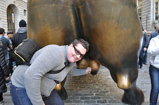 Since we weren't able to take pictures with the crowds at the bull, we headed back to the financial district. It was still crowded, but we got some shots. Nice, Russ decided to punch the bulls balls.We stopped by the stock exchange.
